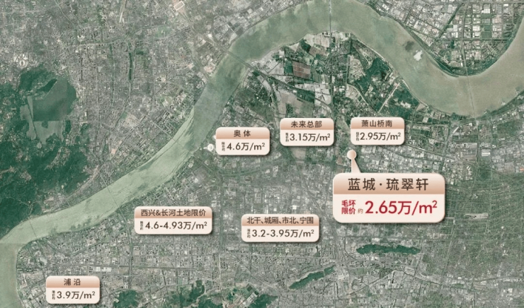滨江的浦沿最低限价3.9万元/㎡,西兴、长河目前已出让的土地限价在4.6-4.93万元/㎡。进入萧山地界后,北干、城厢、市北、宁围等单元的限价基本都在3.2-3.95万元/㎡之间,奥体限价4.6万元/㎡,去年新划入奥体的未来总部社区为3.15万元/㎡。