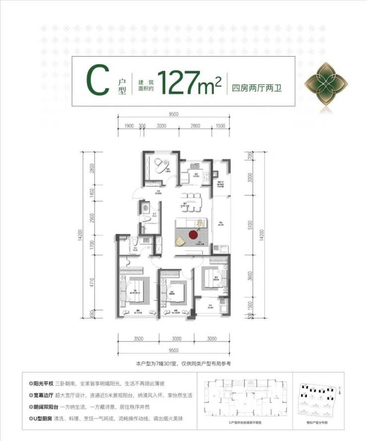 同样是四房两卫的设计,三个卧室朝南。最小的开间都有约3米,再也不用为谁住南卧而纠结,真正实现了“阳光平权”。从玄关进来,就是餐客厅一体化的公区,面积接近27㎡;外接约5.1米的大阳台,视野极度开阔。除了边厅带阳台,南向次卧还有一个阳台。双阳台设计,让这个户型兼顾景观和晾晒功能。