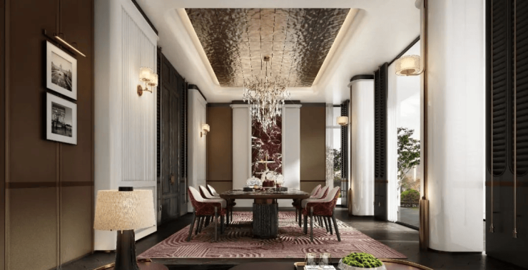 建筑立面取意半岛酒店、帕拉迪奥母题等全球经典建筑,提纯“柱”式元素,以极简洗炼手法,重构永不过时的隽永审美。
