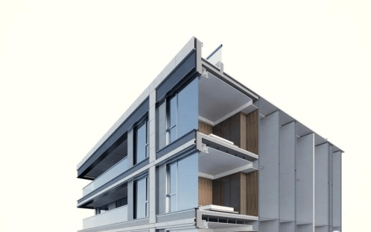 商业雨棚的设计突破了传统图集做法,做了一定的设计思考,通过金属窄框收边,对此部位做了美化处理。