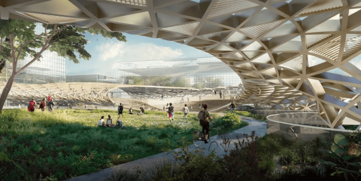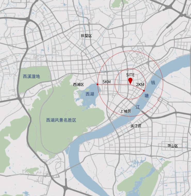 广场位处西湖与钱塘江之间,作为城市的开放式地标广场,面向城市的在地表达是不可忽视的重要命题。设计以流线式的曲面顶盖连接各类功能场所,创造具有城市价值的日常化空间,再现消失的生活情境,由市民谱写自己的新生乐章。
