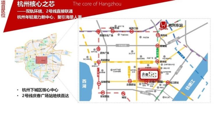 庆春SS地铁一体金铺,自带周边众多醇熟社区、写字楼、医院、酒店等数十万消费客群,构成稳定保底消费市场;作为庆春中心商业下沉式TOD配套,项目为地铁上盖,坐拥地铁2号线庆春广场站磅礴人流,为庆春SS输送预计百万的日客流;占位老杭州商圈核心——与杭大501、庆春银泰三为一中心,成为爆款商业矩阵,“多位一体”的超级流量,聚核于此,轻松躺赢指日可待。