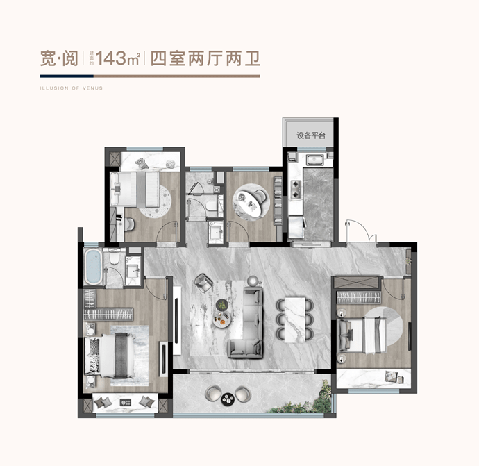 房子不仅仅是身体的收容所,更是心灵的归宿,在空间格局的营造下,熙和樾庭从人居舒适度进行考虑,建筑面积约143㎡四室两厅两卫,让理想生活跃然眼前。