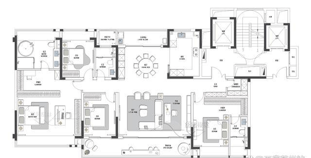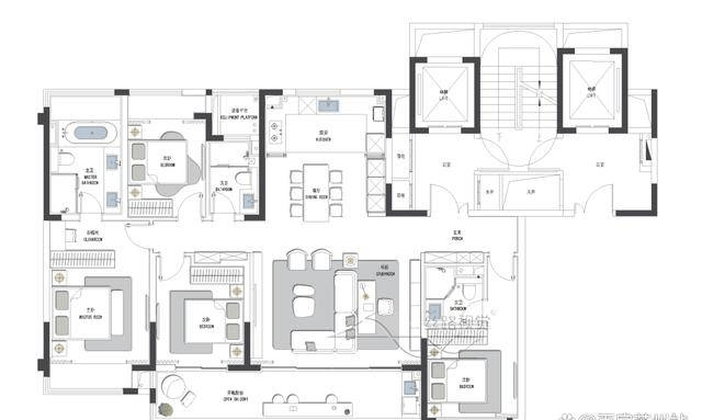 2. 197㎡四房两厅三卫:户型宽敞,功能分区明确,南向大阳台,观景效果好。