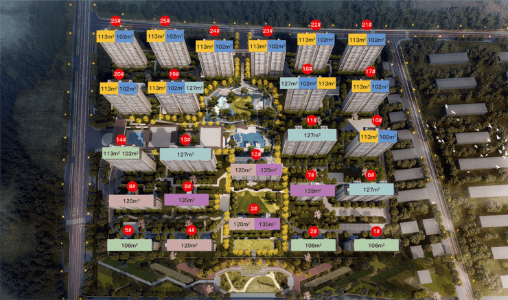 小区共24栋,由9栋8-11层洋房+15栋14-18层小高层组成。