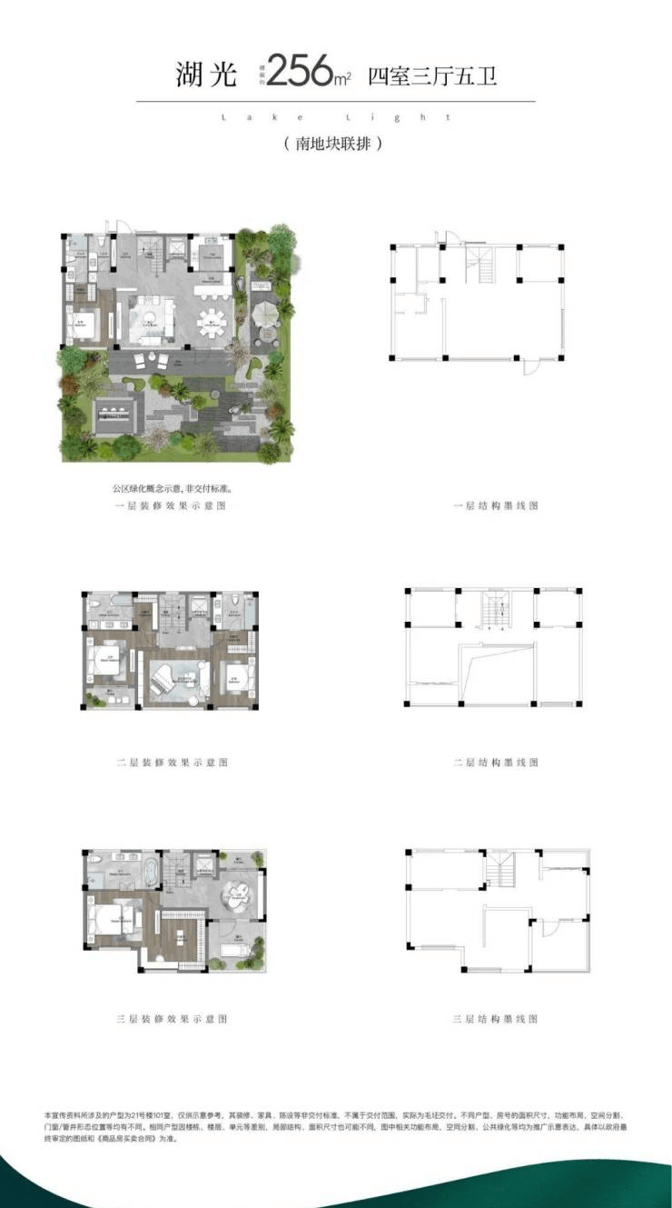 3,南地块联排256平:四室三厅五卫,总价:中间户600万左右,边户700万左右。