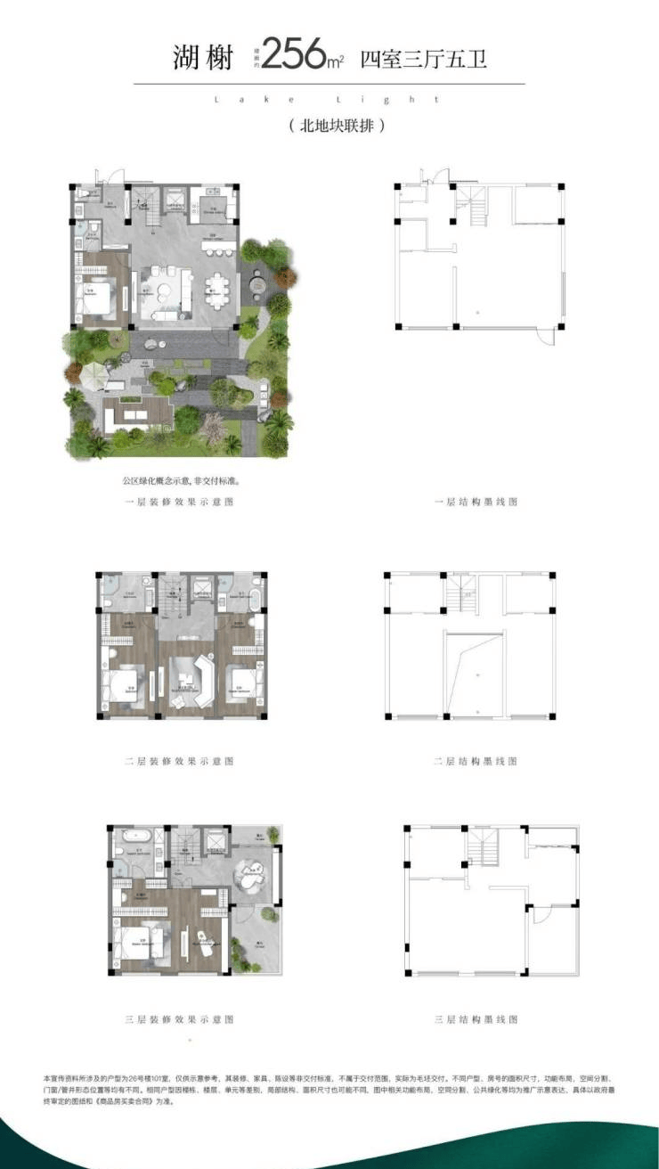 2,北地块联排256平:四室三厅五卫,总价:中间户600万左右,边户700万左右。