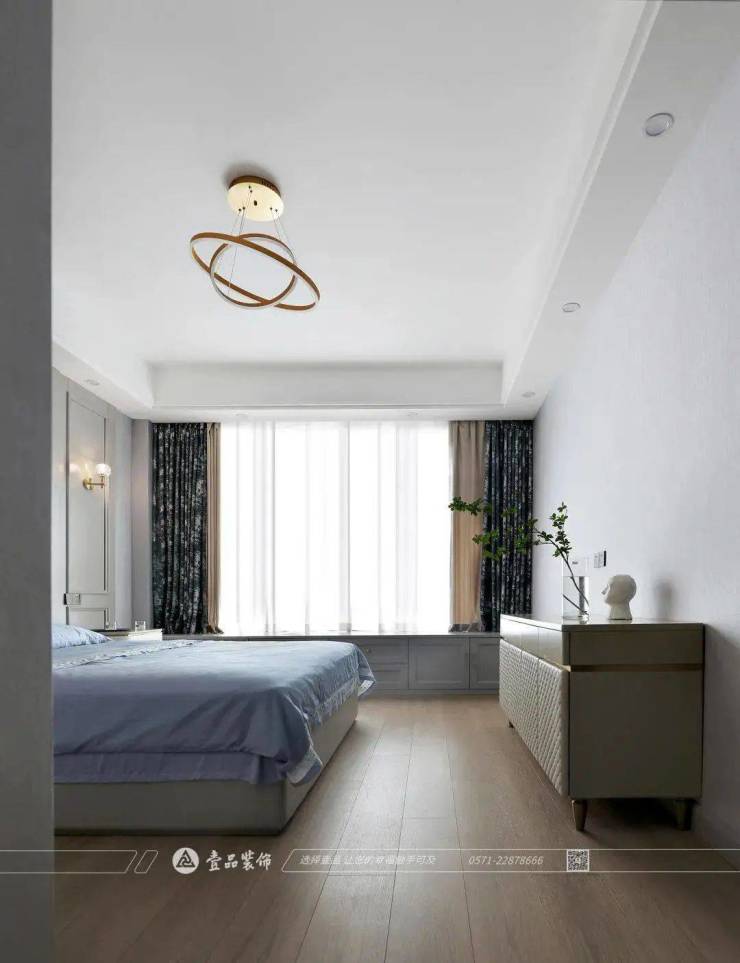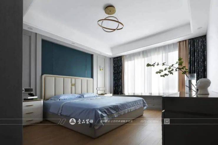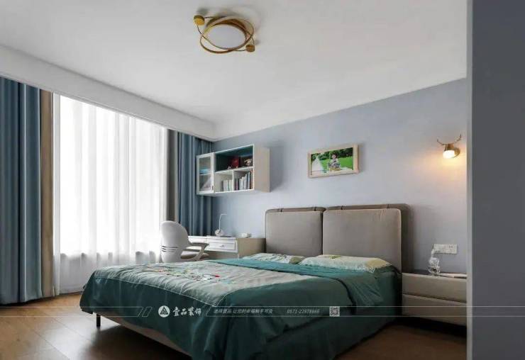 主卧使用孔雀蓝的背景墙呼应灰色整体+亮色搭配的色彩主调,地板色调相比墙面中灰色更为温和柔软,更匹配休憩放松的卧室空间。