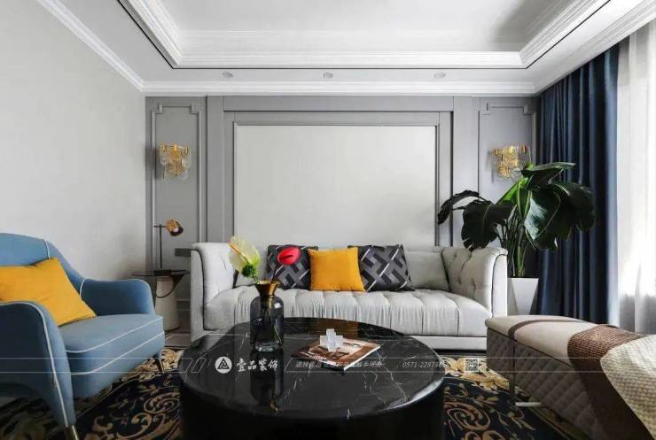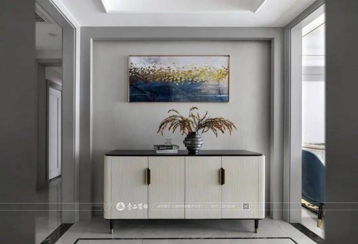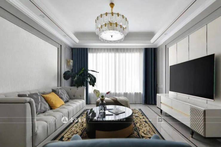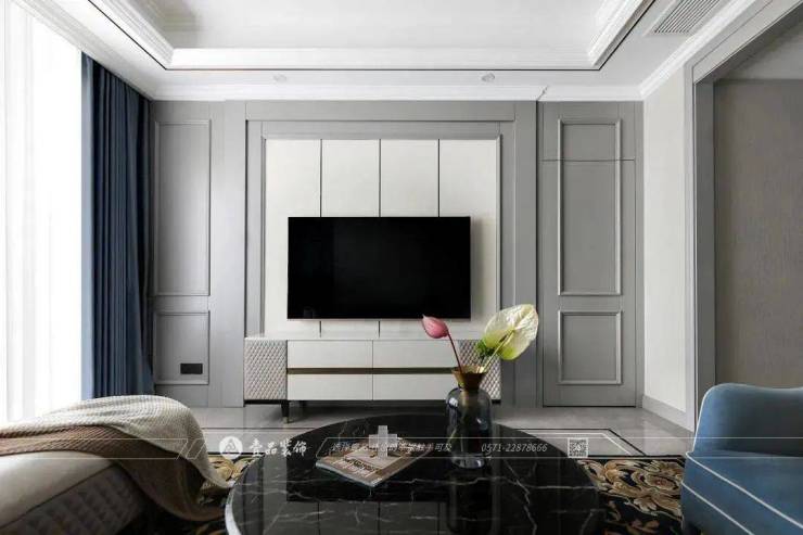 电视机背景墙与沙发背景墙以线条较为复杂的灰色护墙板与浅色材质配合,更多地将视觉重心放在家具搭配而非背景墙面上。
