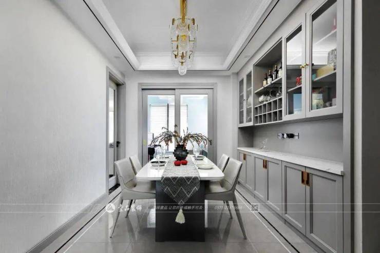 更轻盈的灰色被用在餐厅空间,硬装整体灰度的差别不大,黑色桌脚的餐桌让厚重感立于空间中央。硬装基础越是淡雅,软装配饰的色彩则越显特色。