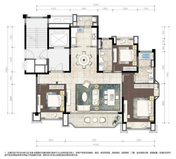 建面约166㎡户型拥有7.1米阔绰横厅,视野开阔,LDK一体化让公共空间走廊直接“消失”提高空间利用率,三房两卫设计对于小家庭来说,属于刚刚好的配置,既不会太奢侈,又不会太过于拥挤。