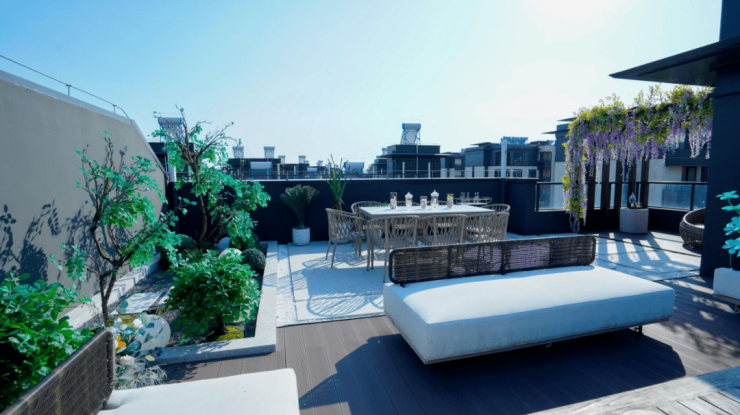 下叠户户定制约2-2.2米高的实体院墙,增强私密性安全性的同时,更具仪式感,院墙内是约70㎡的南北双庭院。