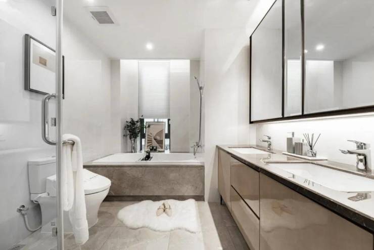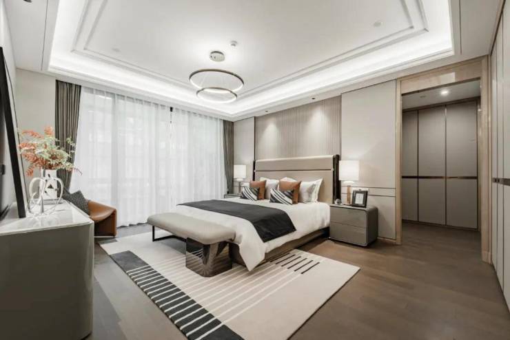⫸✔✔✔滨江云栖名筑售楼处电话:400 808 3612(非物业)✔✔✔⫷主卧重在表现安静的力量。相较于公共空间,主卧在延续黑白灰的基调之外,巧妙地加入了不同质感的蓝色,亚光面、皮革、木材以及布艺软装,温润的亲和感与自然气息窗设计的卫生间,整体居住品质感跃然可见。此外,云栖名筑保姆房和洗衣房也是标配,双入户的设计,敬享尊贵。