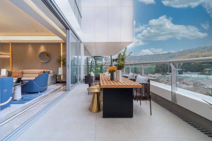 ⫸✔✔✔滨江云栖名筑售楼处电话:400 808 3612(非物业)✔✔✔⫷餐客厅一体化通厅,连接南向独一无二的大露台,配合大面积落地玻璃门,推门远眺就能一览万亩望江山风光以及园区坡地景观,俯仰之间,晕染开自在惬意的漫漫山水生活。