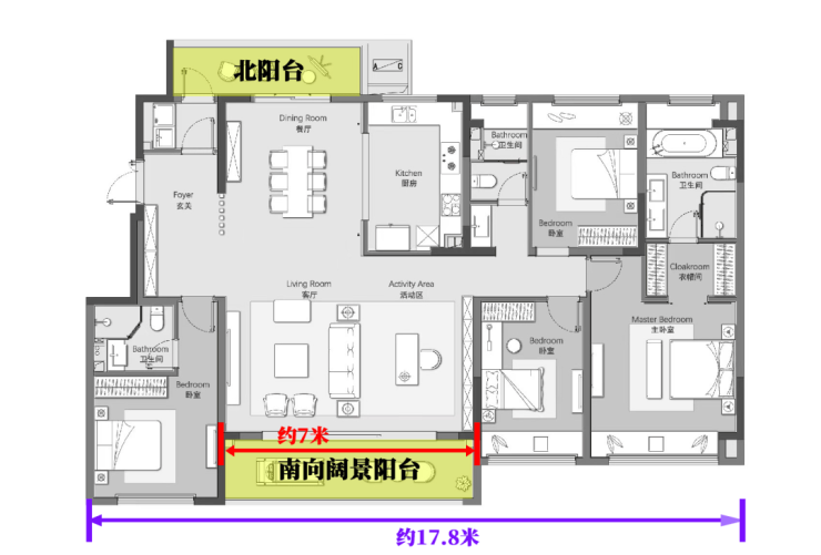 整体户型开间约17.8米,南向五面宽。并配以全景落地窗,无论窗外是绿荫铺陈的静谧,还是霓虹都市般的繁华,都可以在家尽收眼底,大宅的贵气,在这里体现得淋漓尽致。