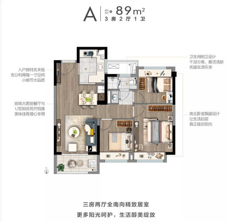 89㎡三房两厅一卫户型,是上城壹号的起步户型,小户型往往更加考验开发商的“真功夫”。