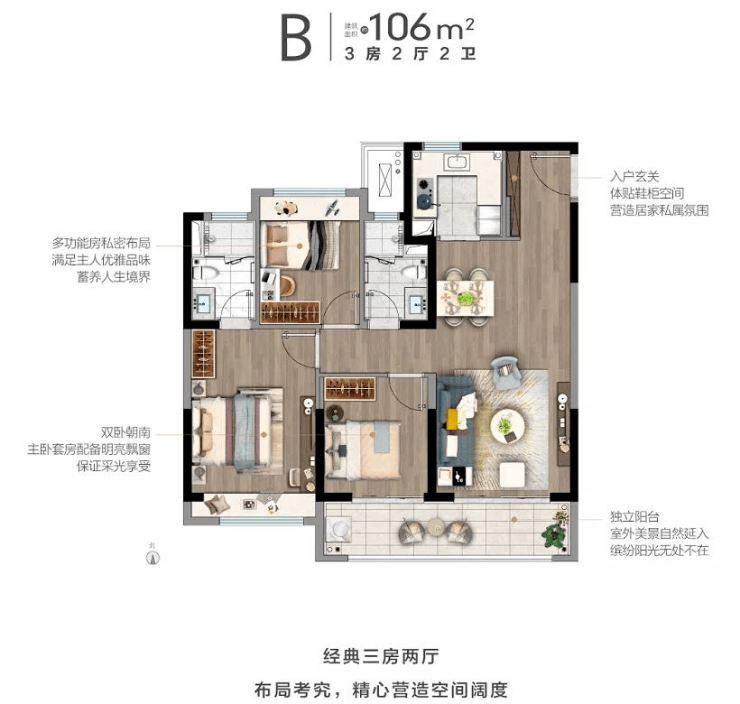106㎡B户型三室两厅两卫,双阳台,整体是89㎡放大版本再加个内卫。