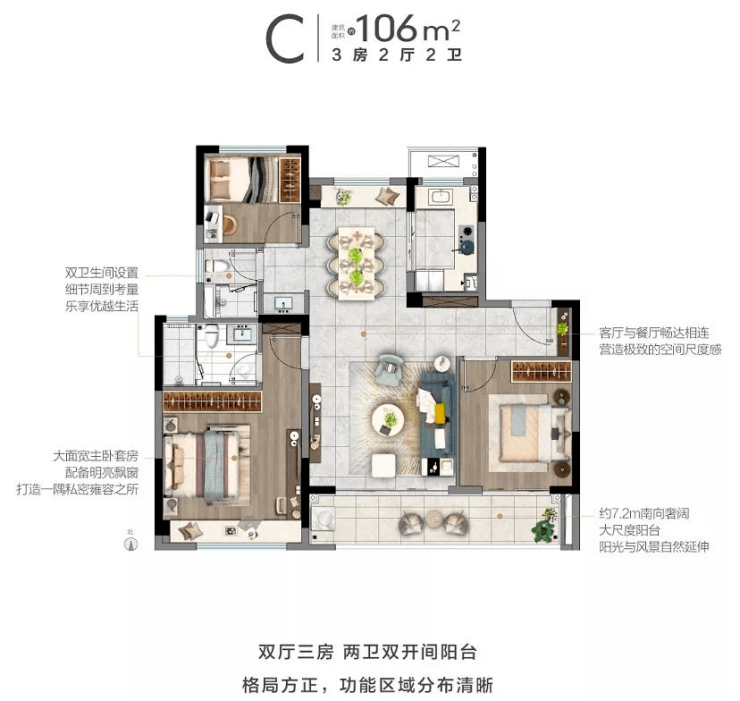 106㎡C户型依然是三室两厅两卫,户型设计成了四叶草户型。7.2米的大阳台是个亮点。主卧依旧带内卫,有点担心以后的这个卫生间的通风问题。