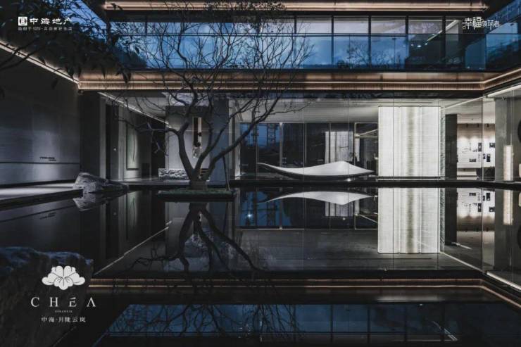 这座水庭也是一整面「水镜」,将中心的乌桕树、周围的超大白玻、精致的艺术雕塑都倒映其中。