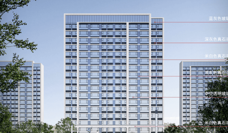 外立面规划为蓝灰、米白与浅灰色,风格偏现代,由大面积中空透明玻璃组成。