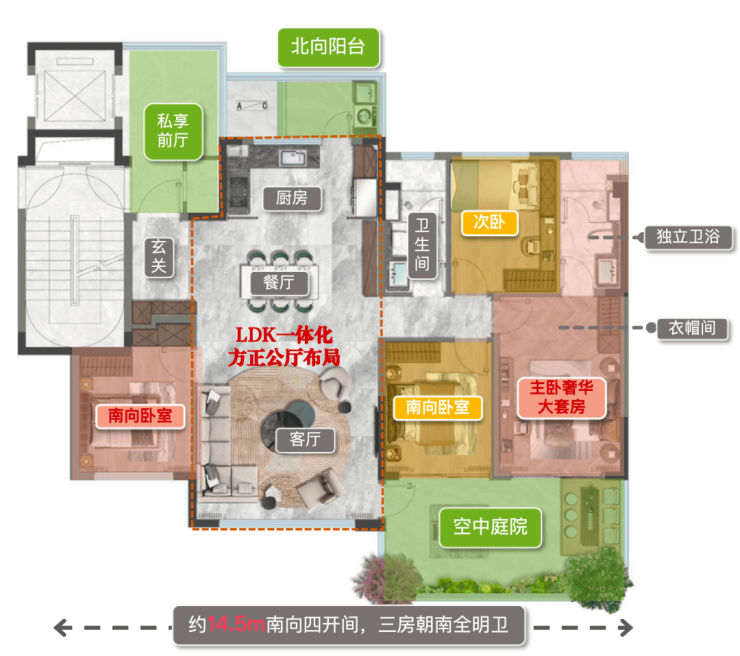 建面约143㎡户型约14.5米南向面宽,在同面积段产品中实属罕见。