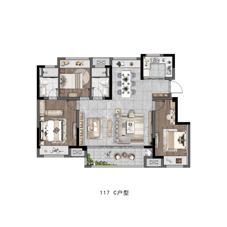 117㎡ 四室两厅两卫:总价约 105–117万元,满足多代同住需求