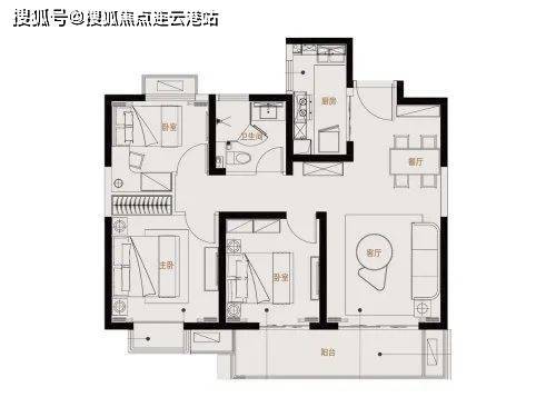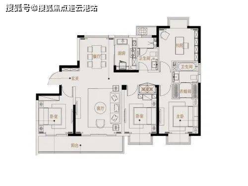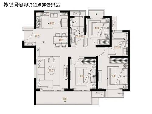 116平:三房两厅两卫,和98平相比,每个功能区的空间都要大一些。除了贯通阳台的卧室,南向主卧和北向次卧都做了飘窗,空间性价比略高于98平。