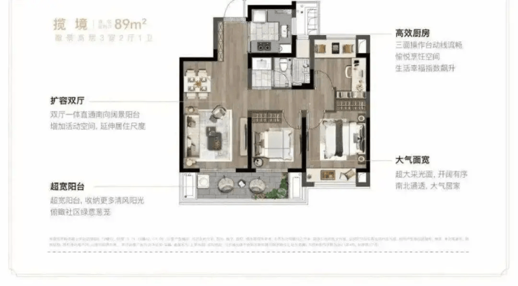 89㎡ 高层三房 150 – 165万 16,856 – 18,563 主力刚需户型,双卫格局,成交活跃