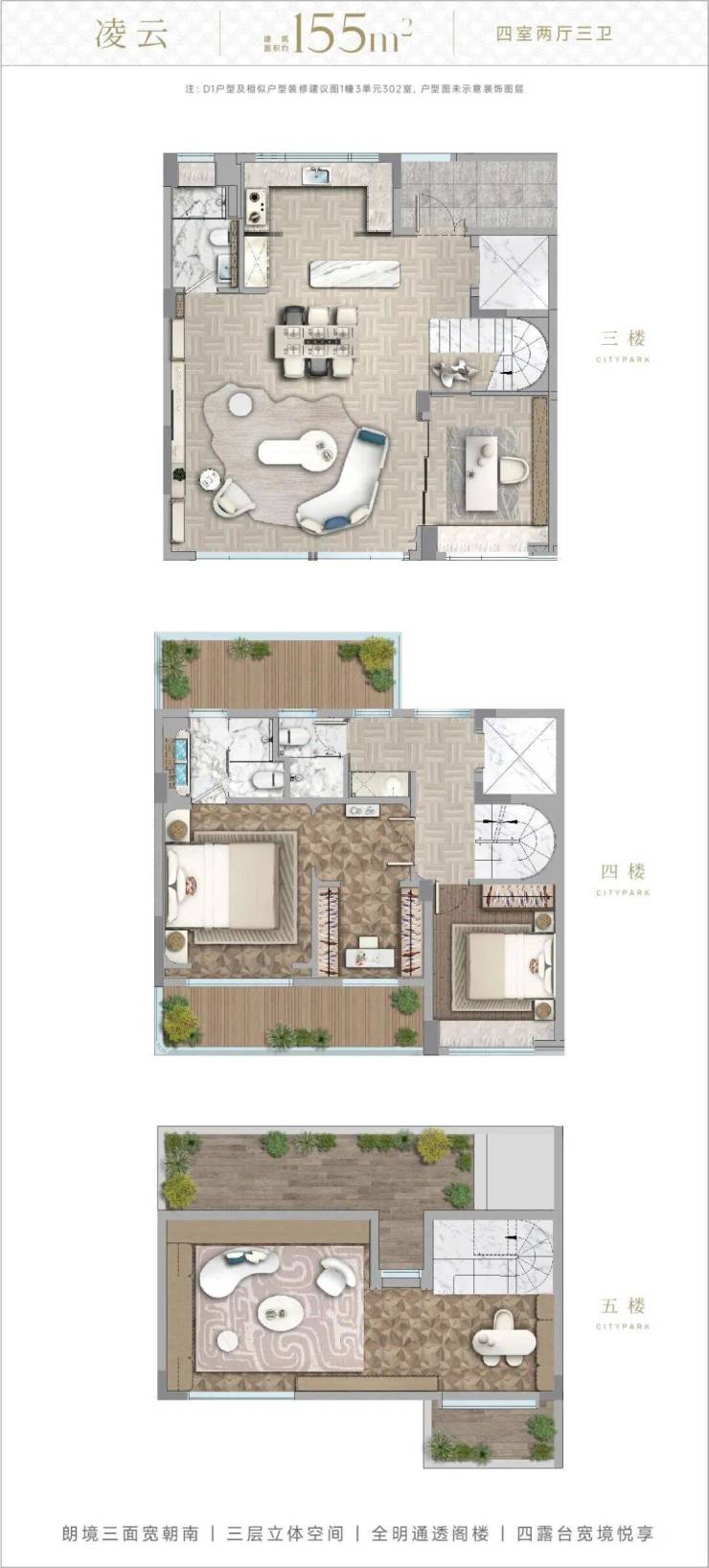 主力户型:125–160㎡四房起步,得房率约78%,全明格局,LDK一体化设计,主卧套房+独立衣帽间,双卫干湿分离,南向宽厅≥4.2米;