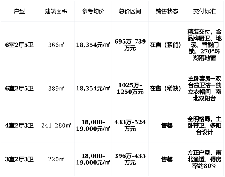 💰 在售情况:主力湖景大平层紧俏在售,中小户型已售罄