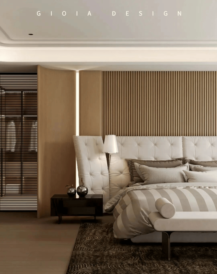 主卧中,Visionnaire Ripley 床架以低调奢华诠释休憩美学。深灰色真皮面料带着荔枝纹肌理,床头绗缝工艺暗藏对称美学,金属嵌条如精致腰带勾勒轮廓,与硬装艺术玻璃形成呼应。两侧悬浮床头柜轻盈悬空,玻璃台面与金属支架透着现代气息,柔和灯光洒在床品上,营造静谧安稳的睡眠氛围。