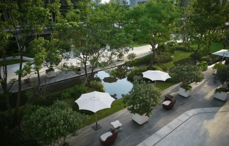 走入T-ONE潮博西区的园区,可以看到一条蜿蜒的水系串联着不同场景,贯穿整个楼盘。在这里,Pok是结合了杭州「钱塘江潮」的在地文化,用溪流与叠水打造出了一座很有度假感的花园。花园中,凡是有户外座椅的地方,就会有微风、树荫与水流的环绕。