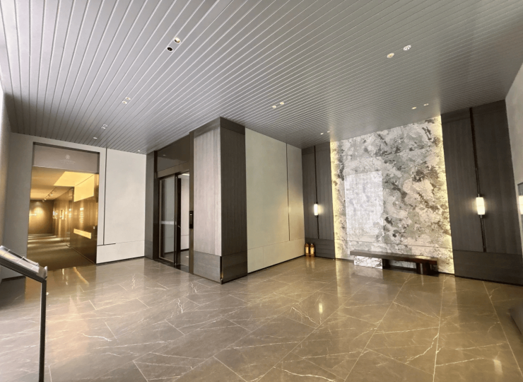 PRADA绿奢石+星空雨棚:入口处大面积使用PRADA绿奢石,搭配约4米高星空雨棚,营造酒店式落客体验