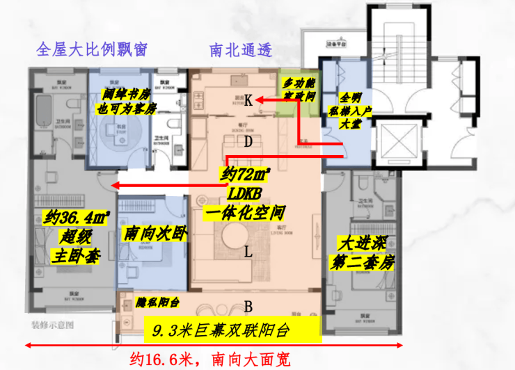约16.6米面宽,四开间朝南,超高采光率;