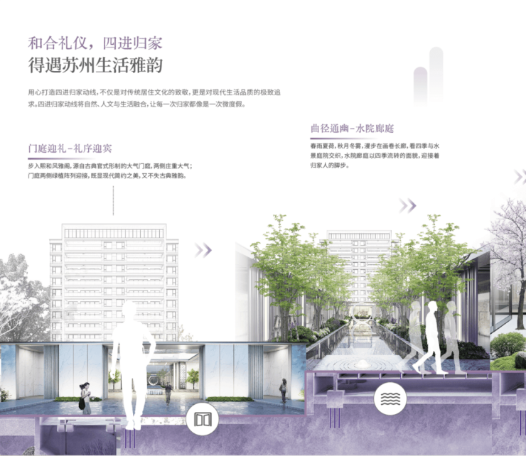 项目精心规划了门庭礼迎-低密园境-漫步庭光-光影空间的四进归家动线,将归家体验打造成一场充满仪式感的旅程。