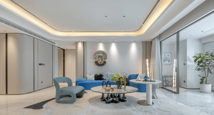 308㎡云座户型:3.6米层高艺术长廊,雪山蓝奢石地面+弧形吊顶,打造"小卢浮宫"式入户体验;中西双厨配德国嘉格纳四件套