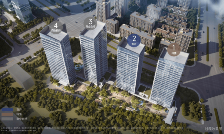 项目总占地面积约1.6万㎡,容积率3.8,由4幢围合式建筑组成,其中2幢为可售商业产品,2幢为自持写字楼。首开楼栋为2#,共42户,一层2户均为边套:东边套312方5房(3套房+1客房+1书房),西边套308方4房(3套房+1书房)