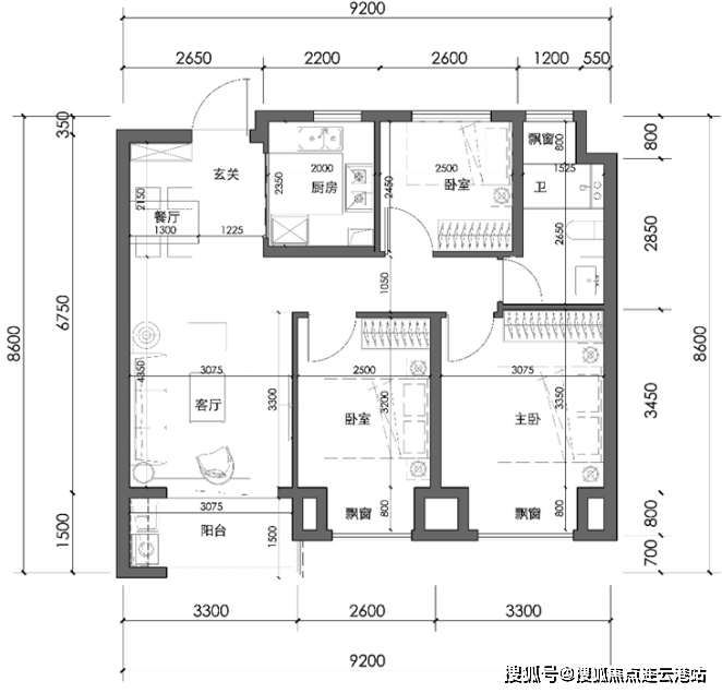 户型解析:轻奢改善产品,面积不过百却做到了3房2厅2卫的设计,户型方正,全明通透,采光充足,同时做到了三开间朝南的布局和南向联通双阳台设计。