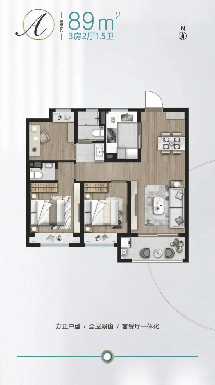 项目主推建面约89–127㎡的三房户型,全系精装交付,满足刚需及改善型家庭需求: