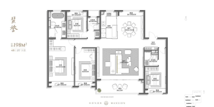 主力户型:纯洋房设计,建面约178㎡、198㎡四房,得房率83-85%,全屋配置6.2米双联阳台、LDKB一体化客厅及独立艺术浴缸