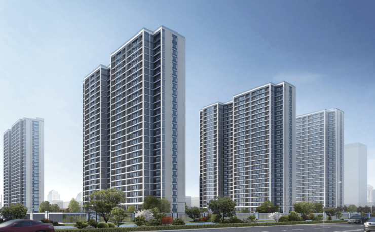 建筑规划 :共4栋27层高层住宅,总户数1033户,采用现代简约风格,干挂石材基座+真石漆主体+大面积玻璃幕墙,约6.8米挑高门头,双大堂入户,归家仪式感强。