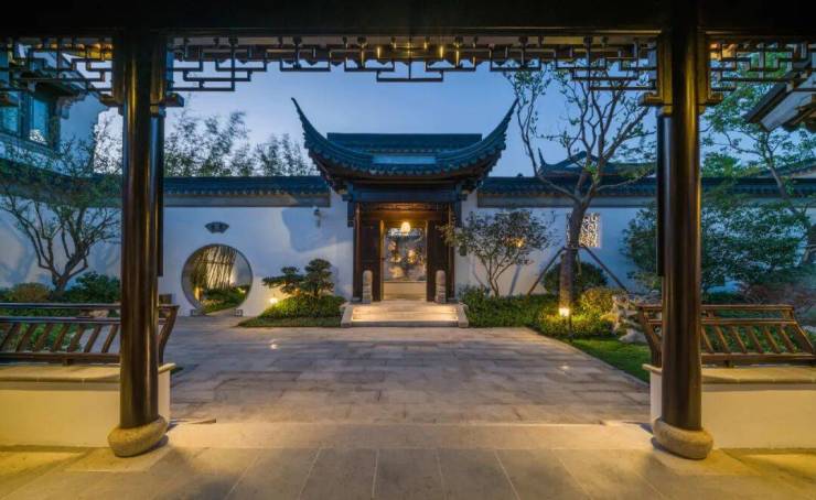 纯中式古典风格,复刻苏州园林“五进制归家礼序”,灰瓦白墙、木雕窗棂、金砖铺地、榫卯结构