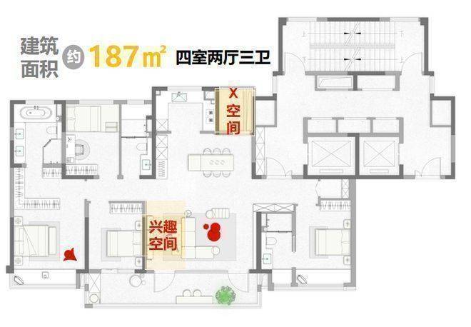 比如此次即将加推的建面约187㎡四房三卫户型,大开间短进深设计,南向双套房阔奢配置,入户前有独立电梯厅、礼仪玄关入户、独立储藏空间,除有生活阳台外还设置有X空间,改善属性拉满,产品形态+面积段在狮山极具竞争力。