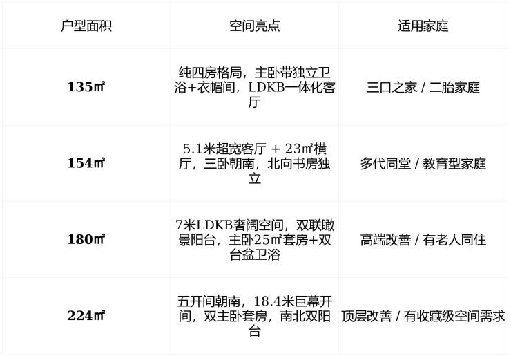 主力户型 :建面 135㎡–224㎡ 全四房设计,无冗余面积,专为改善家庭打造