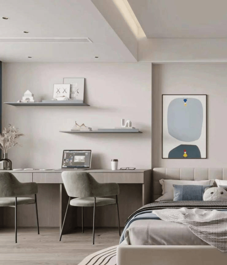 餐厅与客厅一脉贯通,以水吧台与餐桌将空间自然分割,使得舒适度与开阔感最大化,餐厨分而不离,无论家庭聚会亦或一家人的一日三餐,在这里交汇出别致的韵味。