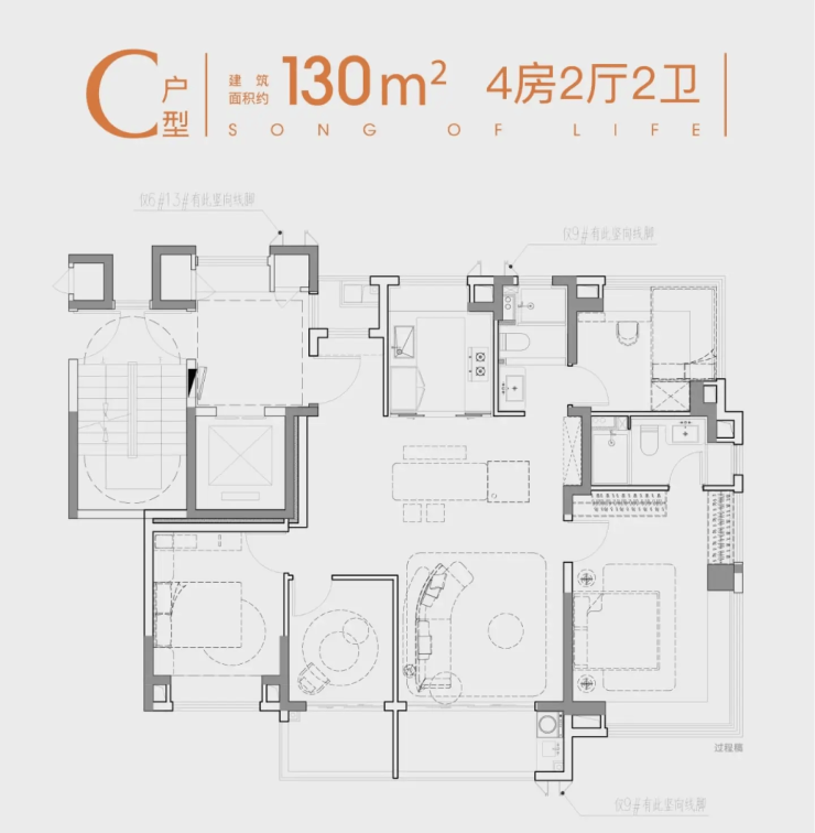 户型特点:多为双阳台+类一梯一户设计,得房率高,视野开阔。