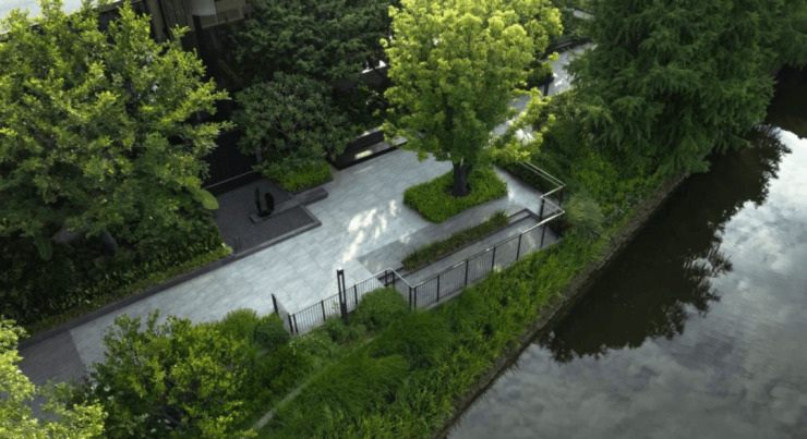 设计延续杭州山水野趣的气质,将自然景观引入城市综合体,通过种植原生植物、打造沿河休闲花园,形成生态共生的整体感,让居者在城市中感受自然的宁静与诗意。
