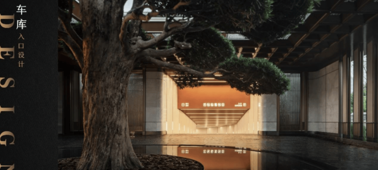 营销中心入口采用“内庭”手法,以“带顶界面+孤植松树”围合空间,强化领域感,弱化硬景装饰性,回应城市美学格调。地下车库设置站台式落客区,搭配水景、绿植和仿日照灯光系统,营造顶奢归家体验。