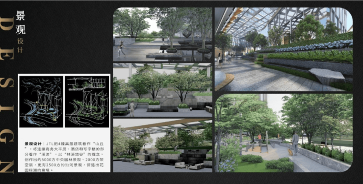 海威安铂中心的景观设计方案由国际知名景观设计机构JTLStudio打造,把 4幢高层建筑看作“山丘”,将连接商务大平层、酒店和写字楼的部分看作“溪流”,以“林溪悠谷”的理念,将自然与城市元素深度融合,营造出高品质的生态景观空间。核心设计亮点如下:
