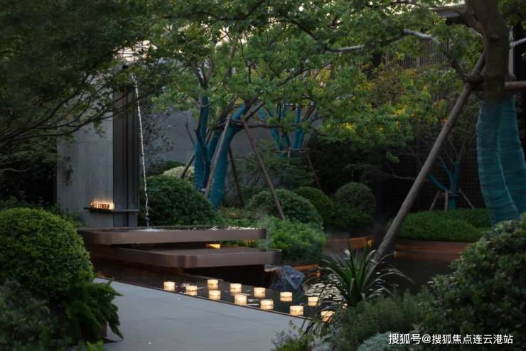 城市的喧嚣在这一隅园林中被沉淀,天色低垂,一池澄澈水面映衬着水乡的灯火通明,设计将夜幕中的灯火点缀在景池中,如江南繁华初绽,繁星摇曳。